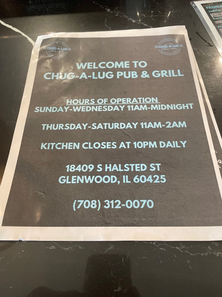 Introducing the menu at Chug A Lug, a vibrant American restaurant located in Glenwood, IL. This casual spot offers delivery and takeout, making it a convenient choice for a variety of occasions. With a range of vegetarian options, it caters to all dietary preferences. The menu features delectable desserts like Banana Chocolate Swirl Cake and Carrot Cake, along with appetizers like Buffalo Chicken Egg Rolls and Chug Nachos. Their burgers, including the Hangover Burger and Mushroom Burger, are sure to satisfy any craving. Customers rave about the flavorful dishes and friendly service, making it a must-visit spot for a fun night out. Don't miss their live music nights on Thursday and Friday, where you can enjoy great food and entertainment in a lively atmosphere. Visit Chug A Lug for a memorable dining experience.